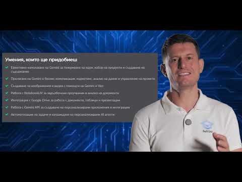 Обучението обхваща широк спектър от приложения - от създаване на разнообразно съдържание, през бизнес комуникация и анализ на данни, до автоматизация на задачи и разработка на персонализирани AI решения. Специален акцент е поставен върху интеграцията на Gemini с Google Drive, както и върху използването на NotebookLM за задълбочени проучвания и Veo за създаване на видео съдържание. Курсът е изцяло практически ориентиран, с множество упражнения и реални казуси, които ще позволят на курсистите бързо да приложат наученото в практиката. След завършване на обучението, участниците ще могат уверено да интегрират Gemini в ежедневните си дейности, да оптимизират работни процеси, да създават иновативно съдържание и да разработват собствени AI асистенти, съобразени с техните нужди.